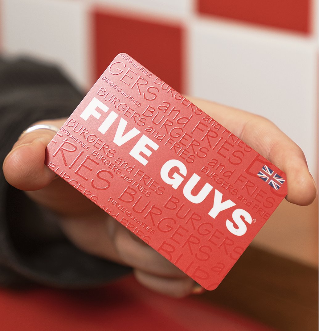 Gift Cards - Five Guys UK eGift Cards (purchased via fiveguys.co.uk) and physical Gift Cards (purchased in England, Scotland & Wales), are only valid for redemption in Five Guys stores located in England, Scotland & Wales. Buy a Five Guys Gift Card eGift Card A quick and easy gift idea. Have an eGift Card sent straight to someone's email for them to use right away! BUY NOW